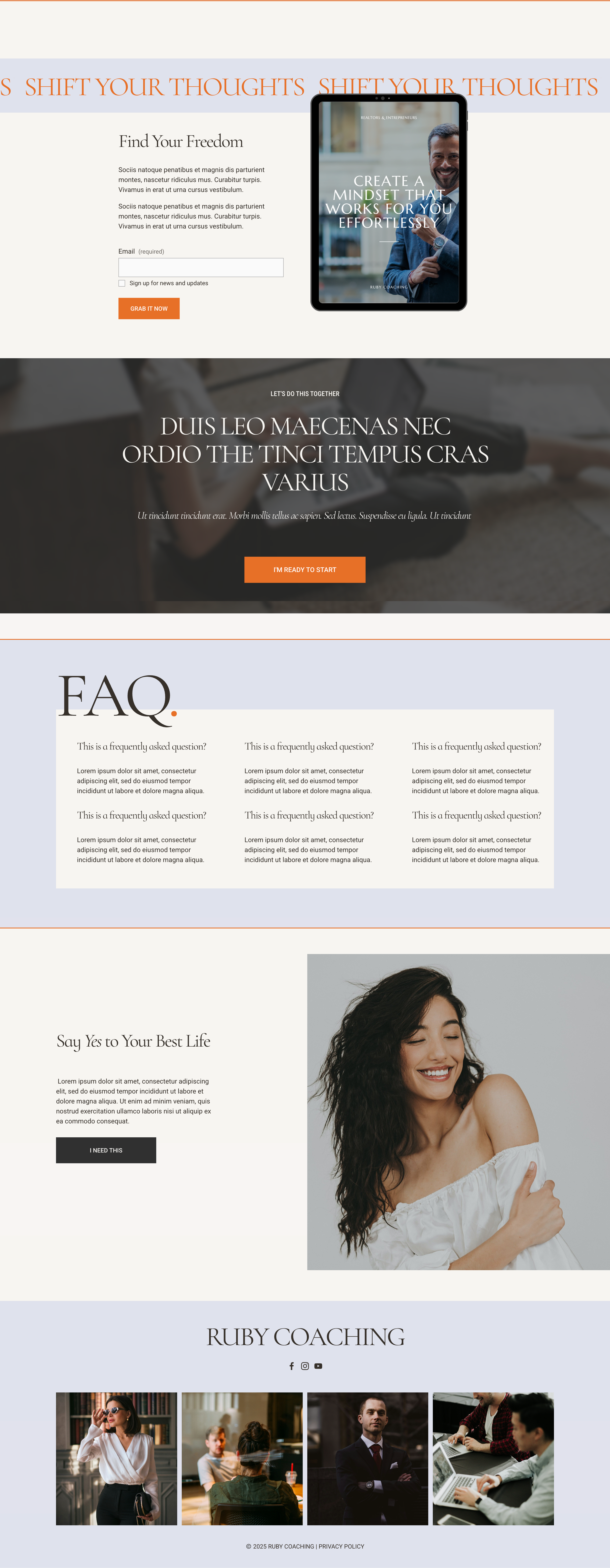 Showcase your business with this stunning, confident, meticulously designed template. Keep the images provided, bring your own, or use a combination of both. Copy will be replaced with your business information - a content planner is included that makes content planning a breeze.